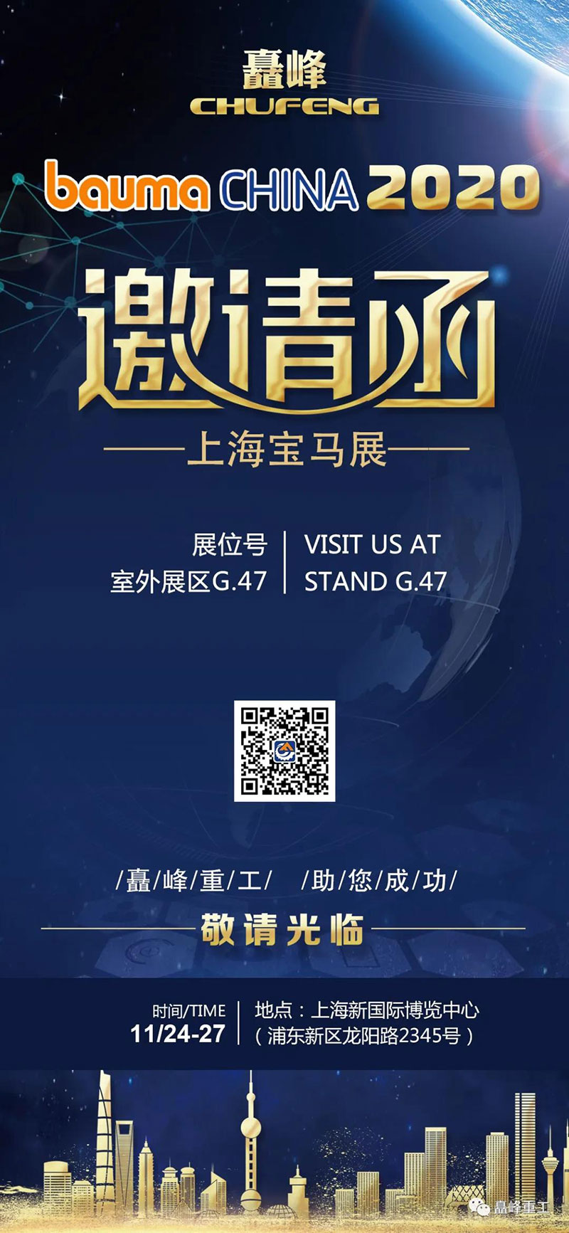 2020年因新冠疫情原因 機(jī)械工程行業(yè)不斷受到挑戰(zhàn)與變化 在這樣的考驗(yàn)中 bauma CHINA 2020依然“如期舉辦” 矗峰重工也“如約而至” 如果可以,愿重啟2020,因?yàn)橥蝗缙鋪淼囊咔椋屗腥舜胧植患?。跌宕走來,不如面?duì)現(xiàn)實(shí),打破彷徨與困境,讓我們用工程機(jī)械的“創(chuàng)”與“新”,答復(fù)2020! 作為高空作業(yè)平臺(tái)領(lǐng)軍行業(yè)的矗峰重工,率領(lǐng)優(yōu)秀團(tuán)隊(duì)及眾多精品強(qiáng)勢亮相展會(huì),豐富的產(chǎn)品系列及技術(shù)資料。 在此,山東矗峰重工機(jī)械有限公司誠摯邀請(qǐng)您蒞臨。 希望通過這個(gè)平臺(tái)共同探討和交流,我們能更加深入的合作,更好的開拓和占領(lǐng)市場,望您能撥冗出席,我們不勝榮幸!